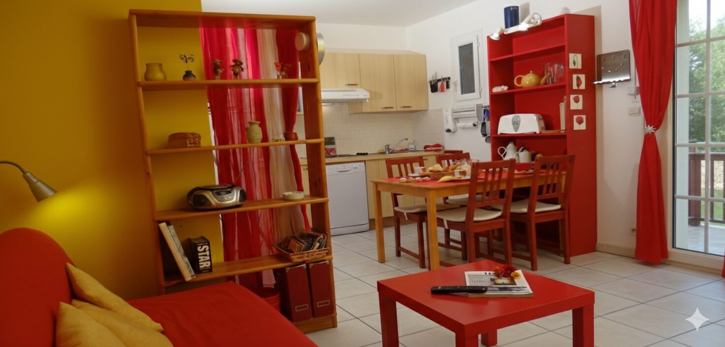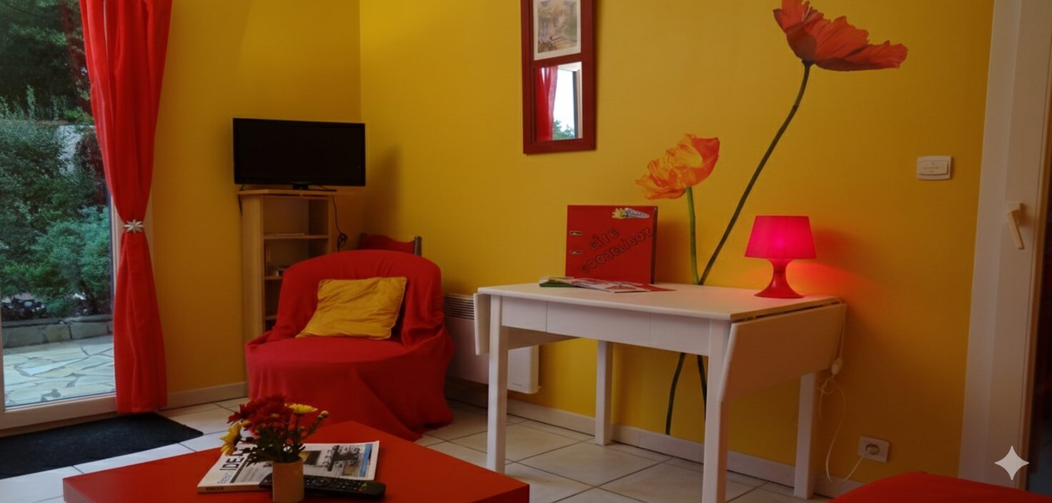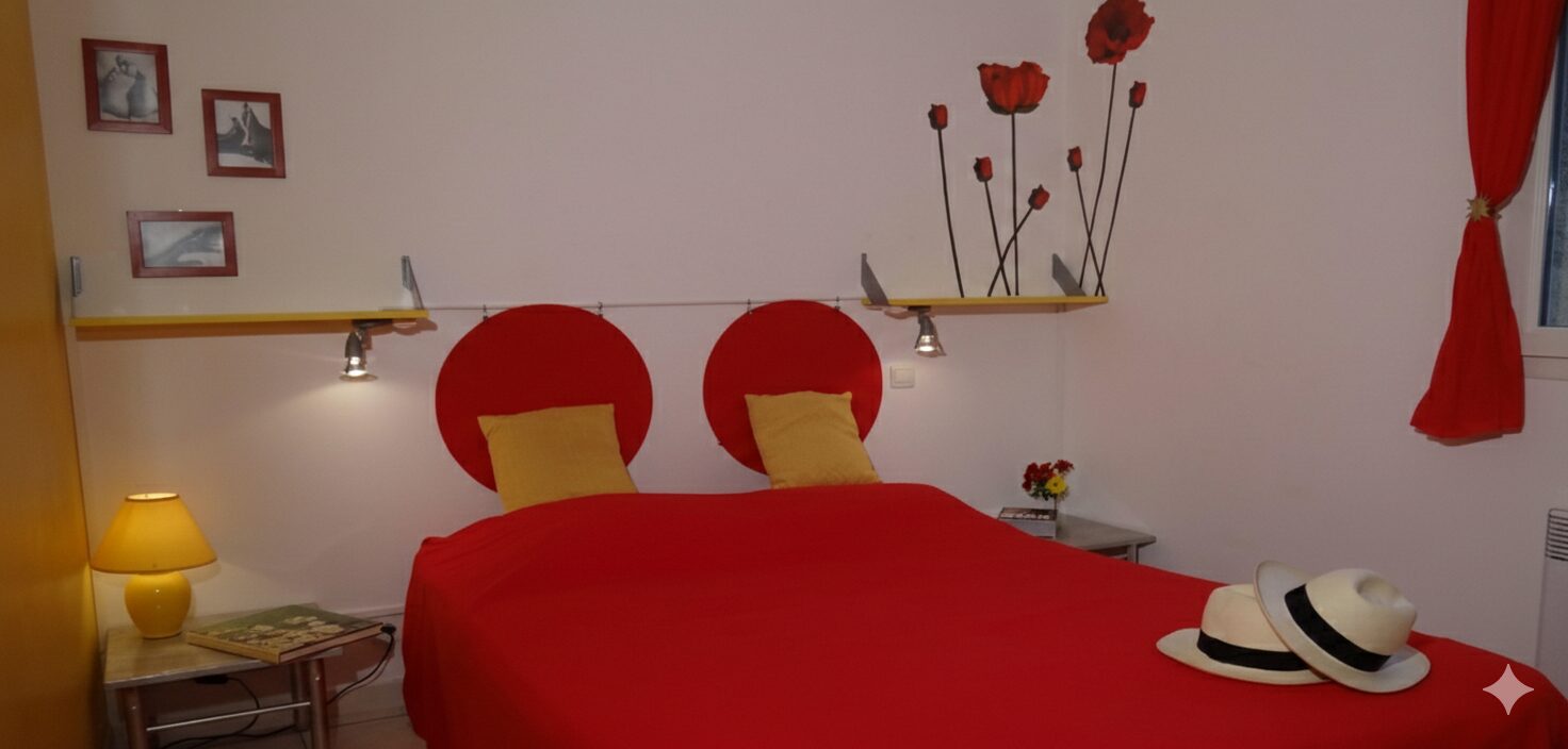 Un Nid Douillet entre Fleurs et Soleil... Laissez-vous charmer par l'atmosphère vibrante du Gîte Coquelicot. Ce cocon de 45 m², décoré aux nuances chaudes de fleurs rouges et orangées, est l'escale idéale pour un séjour en famille ou un moment d'évasion à deux en quête d'espace.