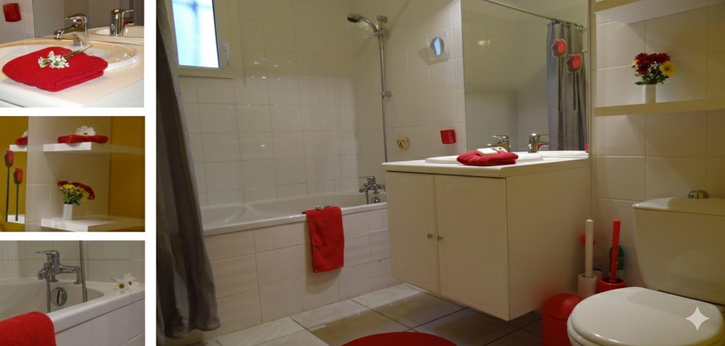• Salle de bain : Une large baignoire pour se détendre, un meuble lavabo avec grand miroir et WC.